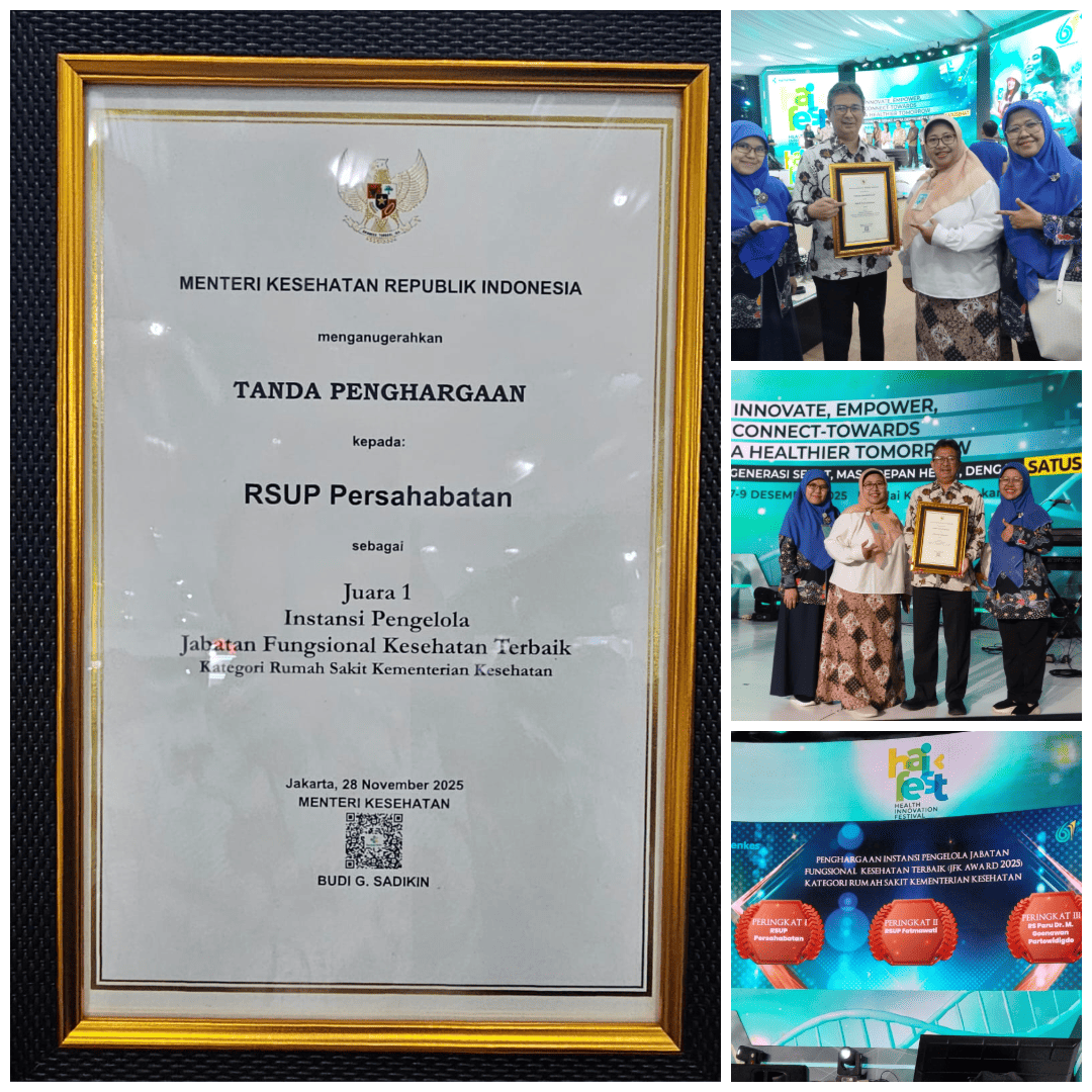 rspersahabatan.co.id,Jakarta. Kementerian Kesehatan Republik Indonesia memberikan penghargaan dalam rangka Hari Kesehatan Nasional ke-61 dengan tema "Generasi Sehat, Masa Depan Hebat" di Balai Kartini, Rabu (9/12/2025). RSUP Persahabatan mendapatkan Penghargaan Jabatan Fungsional Kesehatan (JFK) Award Tahun 2025 dengan Peringkat Pertama sebagai Instansi Pengelola Jabatan Fungsional Kesehatan Terbaik Kategori RS UPT Vertikal Kementerian Kesehatan yang diterima oleh Direktur Utama RSUP Persahabatan Prof. Dr.dr. Agus Dwi Susanto, Sp.P(K),MHPM,FISR, FAPSR. Penganugerahan Penghargaan Instansi Pengelola Jabatan Kesehatan (JFK) Award Tahun 2025 ini diberikan atas pengabdian, prestasi kerja, dan inovasi dari tenaga medis atau tenaga kesehatan dibawah Kementerian Kesehatan Republik Indonesia serta berhasilnya RS Persahabahan dalam mengelola Jabatan Fungsional Kesehatan (JFK) dalam lingkup RS UPT Vertikal Kementerian Kesehatan.Dihari ketiga Hai fest, RSUP Persahabatan melakukan pemeriksaan spirometri bagi pengunjung, dengan jumlah 30 orang. Antusiasme pengunjung untuk melakukan pemeriksaan sangat tinggi, hingga banyak pengunjung yang tidak kebagian kuota pemeriksaan. Dalam kegiatan ini, Direktorat Jenderal Kesehatan Lanjutan mendapatkan juara Booth terbaik. Tema...