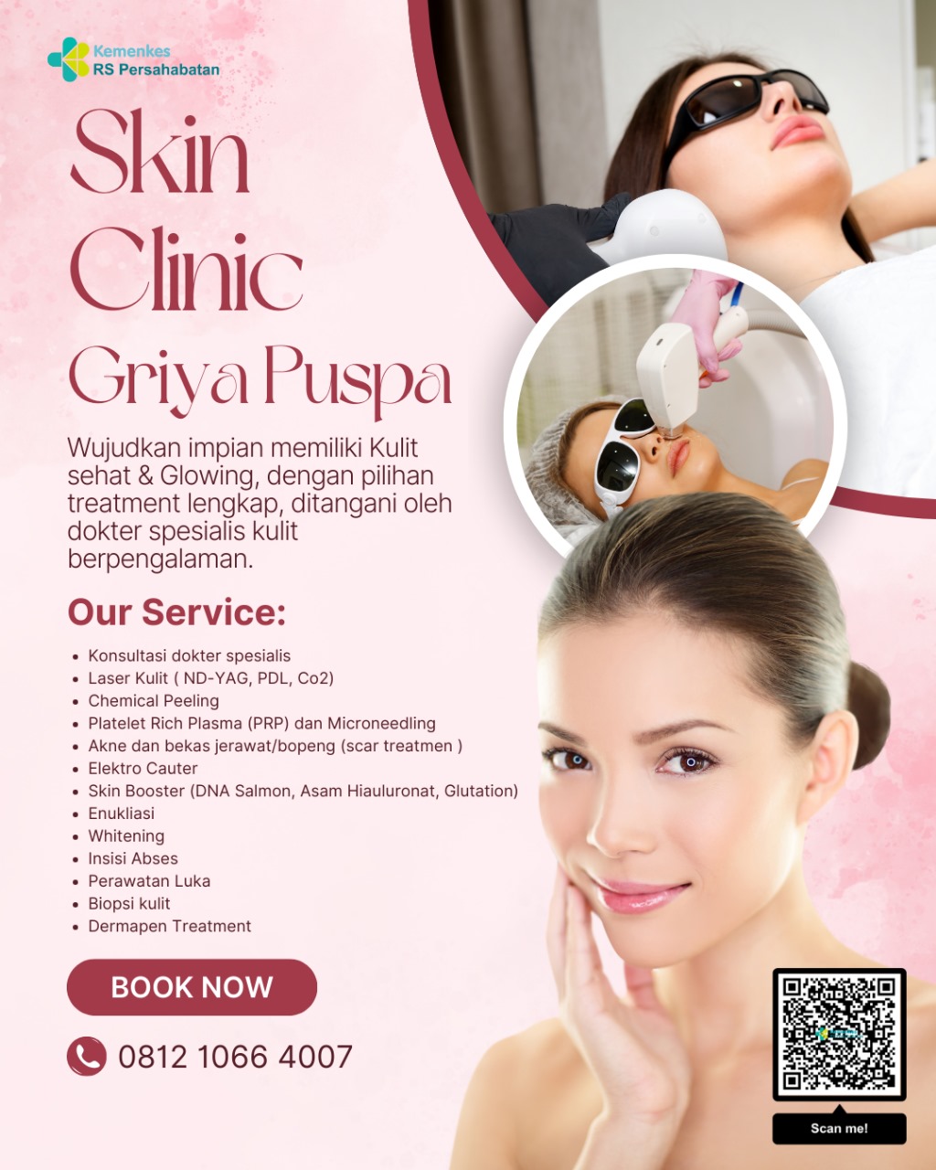 β¨ **Skin Clinic β Griya Puspa RS Persahabatan** β¨ Tempat **perawatan kulit terpercaya** dengan penanganan medis oleh **Dokter Spesialis Kulit & Kelamin** profesional!Kami menyediakan layanan lengkap untuk kulit sehat, cerah, dan bebas masalah:β Konsultasi Dokter Spesialis Kulit β Laser Estetik (ND-YAG, PDL, CO2) β Chemical Peeling β PRP & Microneedling β Regenerasi kulit alami β Scar Treatment β Atasi bekas jerawat & luka β Elektrokauter β Hilangkan kutil & lesi kulit β Skin Booster (DNA Salmon, Glutathione, Asam Hialuronat) β Enukleasi β Penanganan kista & benjolan kulit β Whitening β Cerahkan kulit secara aman β Insisi Abses β Penanganan infeksi kulit β Perawatan Luka Kompleks β Biopsi Kulit β Deteksi dini kelainan kulit β Dermapen Treatment β Teknologi canggih untuk kulit mulus!Kulit sehat bukan impianβ**mulai perawatanmu di tempat yang tepat, dengan standar rumah sakit!** πΏπ **Info & booking:** 0812 1066 4007 π **Kunjungi:** www.rspersahabatan.co.id #SkinClinicGriyaPuspa #RSPersahabatan #DokterKulitProfesional #PerawatanKulitMedis #CantikSehatAlami πββοΈβ¨...