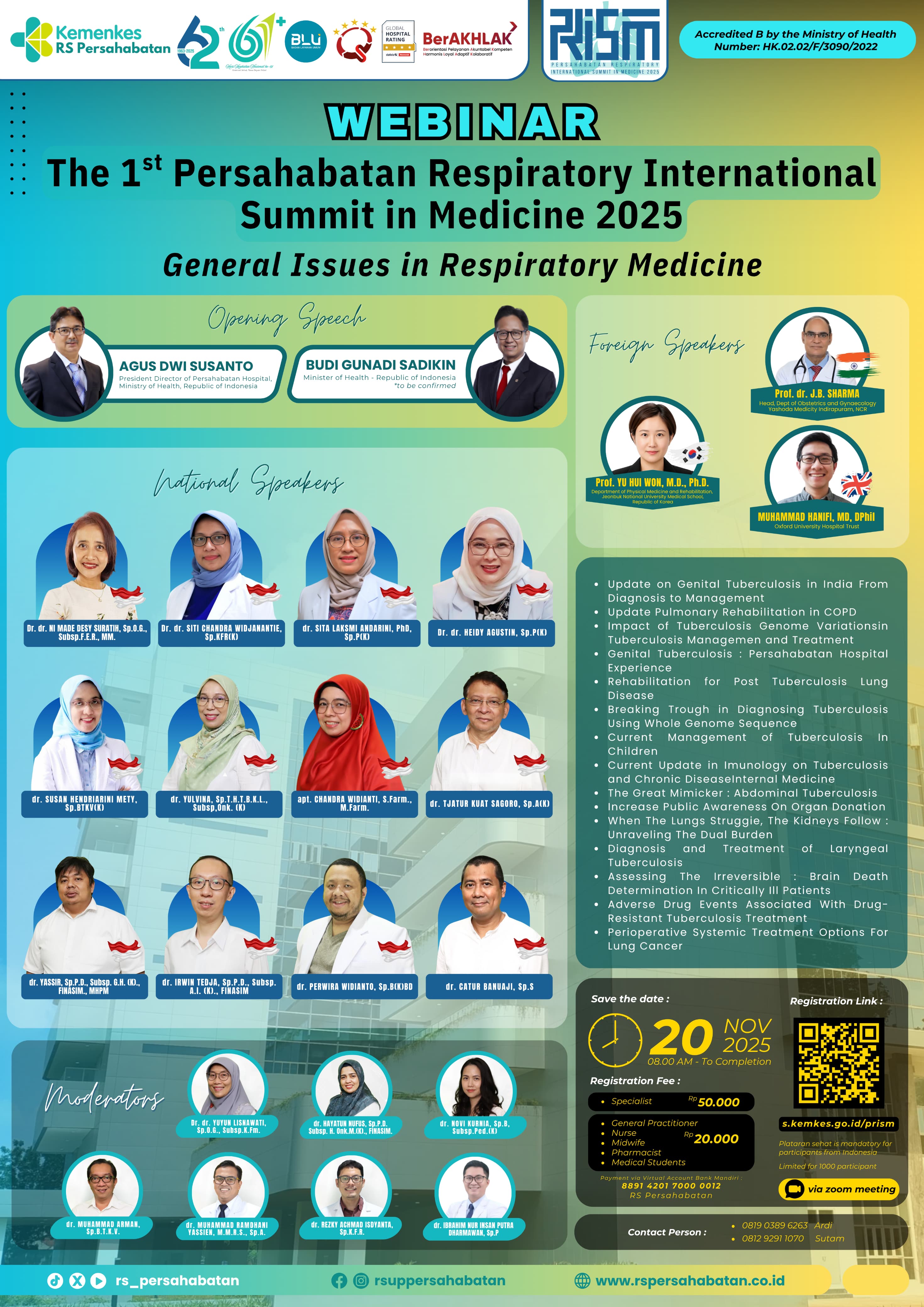 Sebagai RS Rujukan Respirasi Nasional dan dalam rangka HUT RSP yg ke 62th serta memperingati HKN ke 61 , maka Bersama ini kami RS Persahabatan mengundang Bapak/Ibu utk hadir mengikuti Webinar The 1st Persahabatan Respiratory International Summit in Medicine 2025 :Hari/Tanggal : Kamis, 20 November 2025Waktu : 08.00 β 16.00 WIBTopik : General Issues in Respiratory MedicineMenghadirkan 3 Narasumber International :π¨ββοΈMuhammad Hanifi, PhD, MDπ¨ββοΈProf dr J.B Sharmaπ©π»ββοΈProf Yu Hui Won, M.D, PhDDan ada 12 Narasumber internal RS PersahabatanTarget peserta: Tenaga Medis d Tenaga KesehatanKuota Peserta : 500 orangSilahkan scan barcode utk Registrasi πDemikian informasi dari kami ...salam Persahabatan ππππ Panitia PRISM RS Persahabatan...